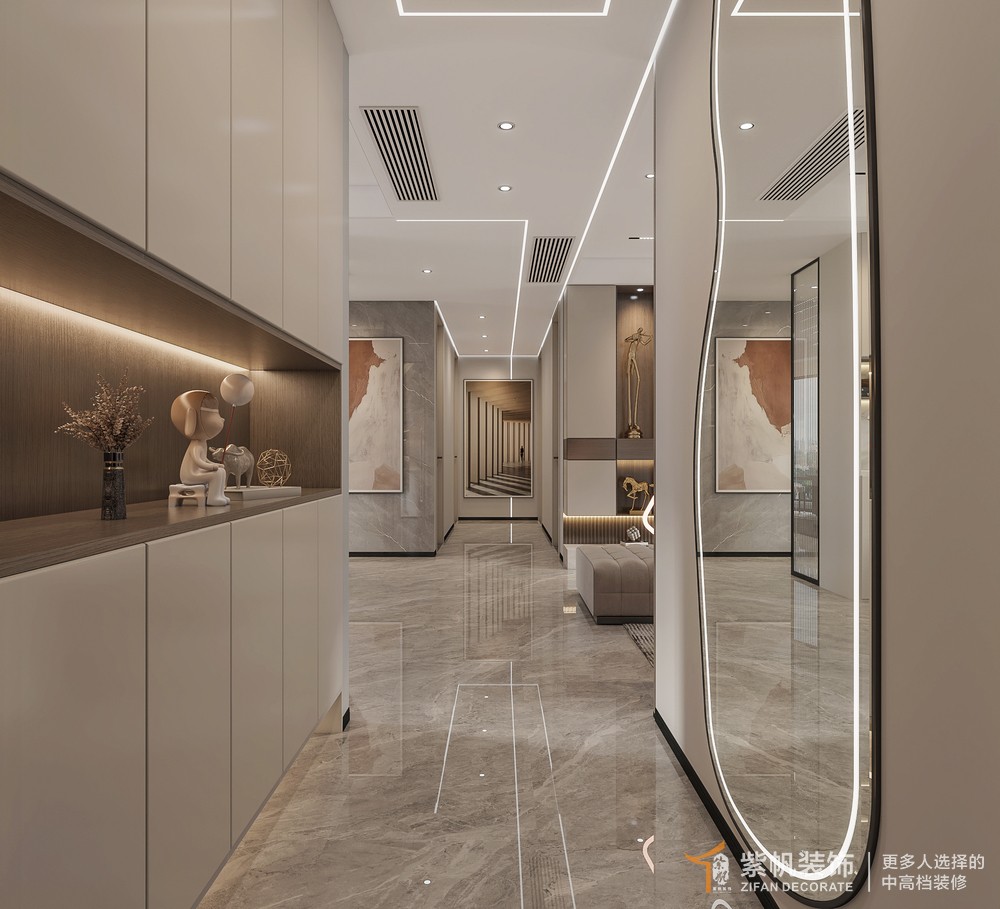 案例说明:业主喜欢家里有很多的储物空间,所有的物品尽可能的收纳到柜子里,在设计的过程中考虑了每个空间方方面面的细节,包括电视背景也是采用收纳柜+展示柜的形式体现,全屋壁布,大板砖通铺,搭配护墙板、岩板等背景墙造型,提高空间高级感,提升业主的居住品质。