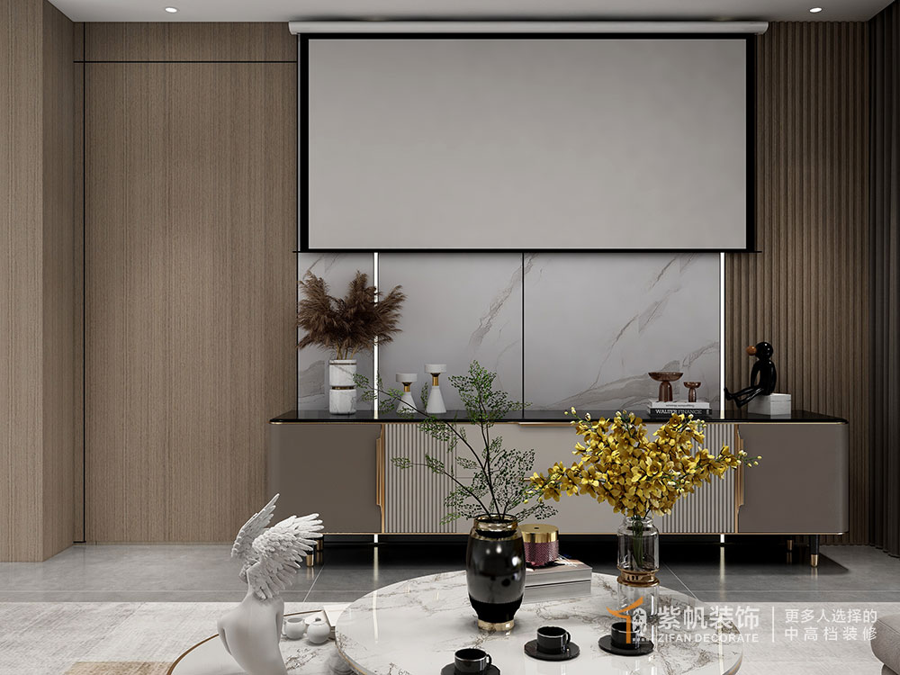 案例说明:业主的要求是现代时尚大气潮流,设计时运用了现在流行的无主灯的设计,吊顶超平大气,磁吸轨道灯,增加光源层次感,为了让孩子少看电视,采用暗藏式卷轴幕布+投影仪,逢年过节或平时偶尔看一下大片儿。四个房间分布在四周,很棒的四叶草户型,不管是大人加班,孩子上网课,还是老人休息的早,一家人互不打扰,并且与客餐厅动静区分,营造美好生活氛围。