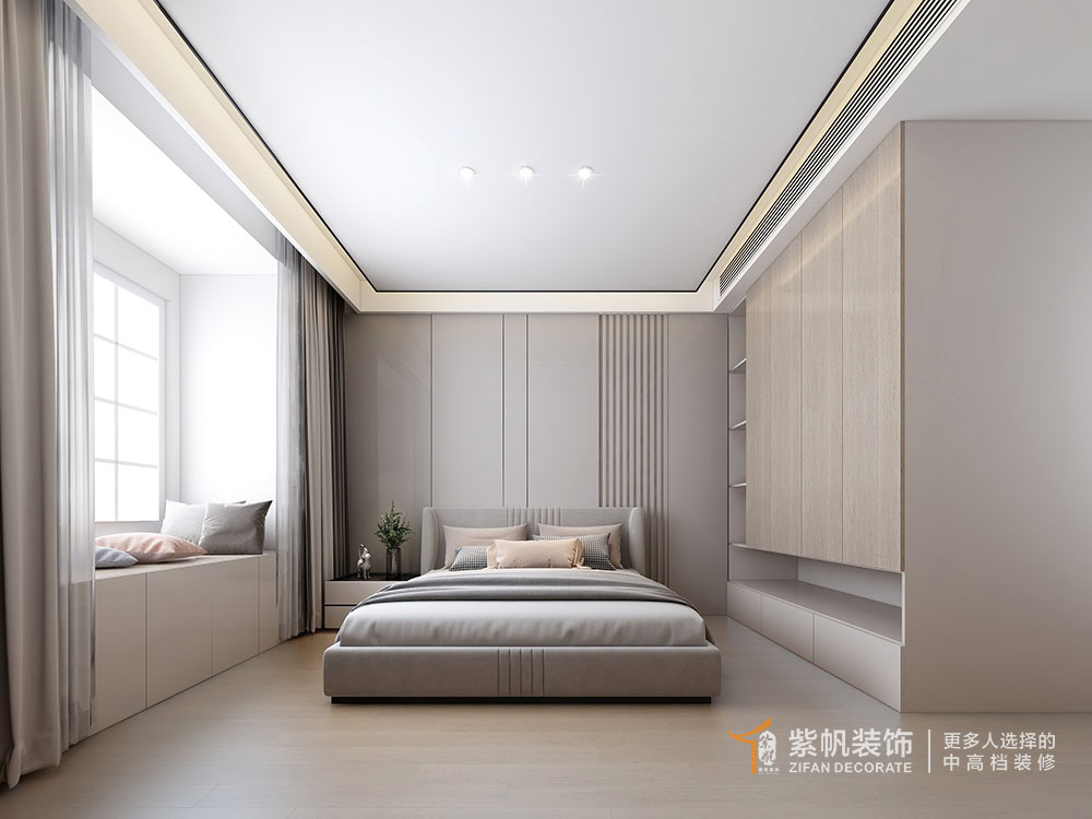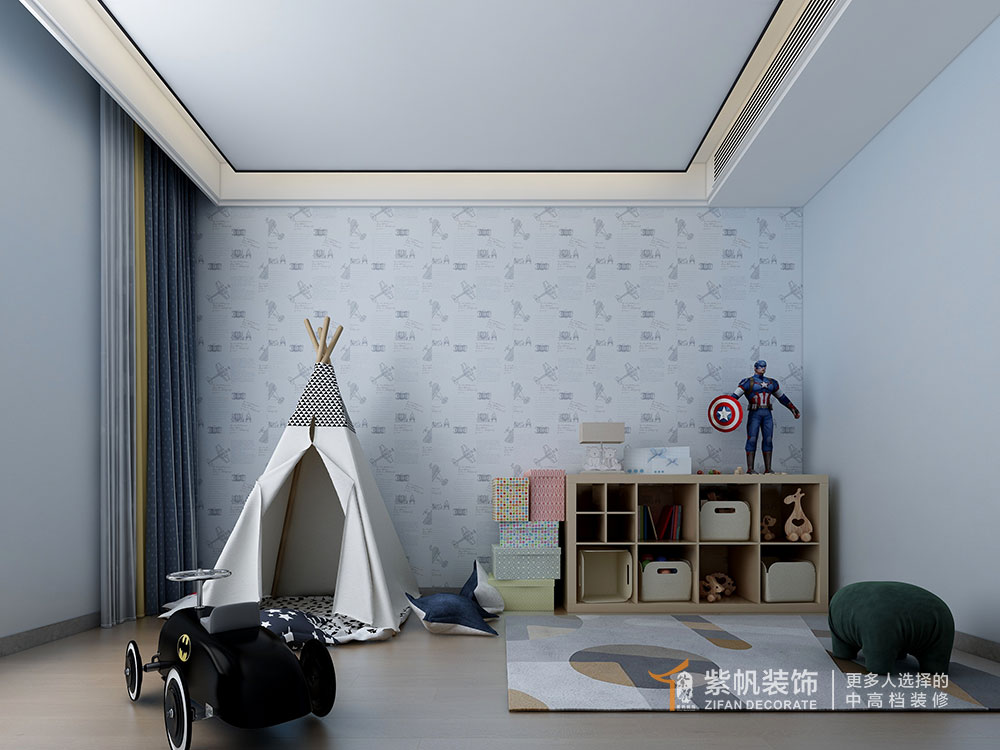 案例说明:业主装修婚房,设计了时尚简约的现代风格,还有餐桌岛台一体式的餐厅,方便使用和聚餐。考虑到业主未来会有孩子,不过孩子独立居住会是几年后,暂时还用不上儿童房,就设计为儿童娱乐室,孩子小的时候方便玩耍,提前预留好电源位置,方便以后灵活调整。主卧室的主卫对着床,设计了L型的步入式衣帽间,增加储物空间,还能遮挡主卫门。沙发背景设计为木格栅护墙板隐形门,好看大气,去客厅化设计,没有传统的电视墙,设计了隐藏的卷轴幕布,需要时打开即可。