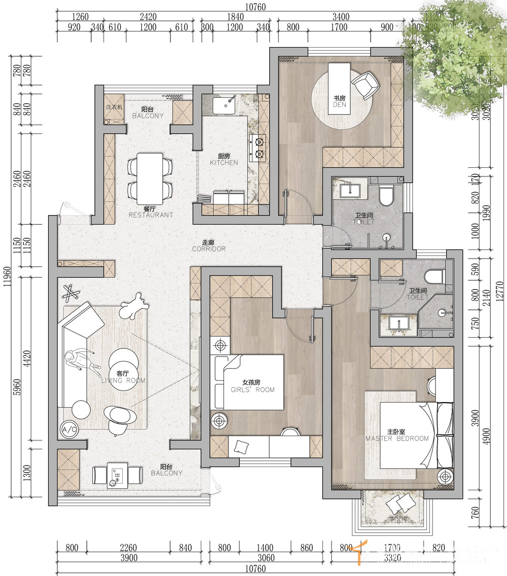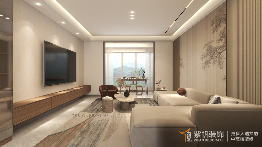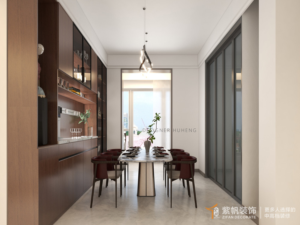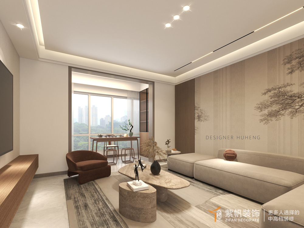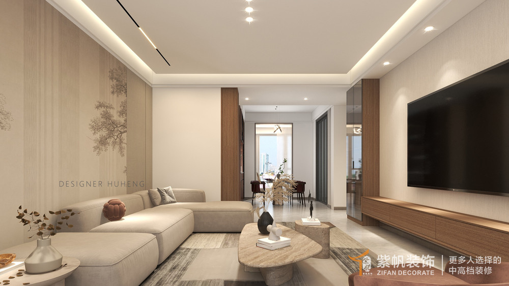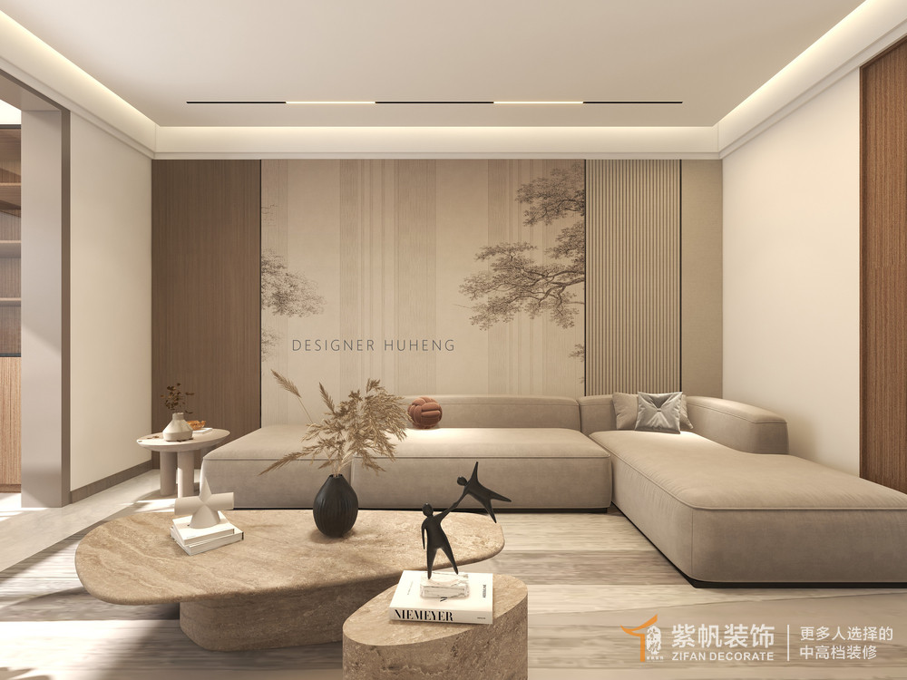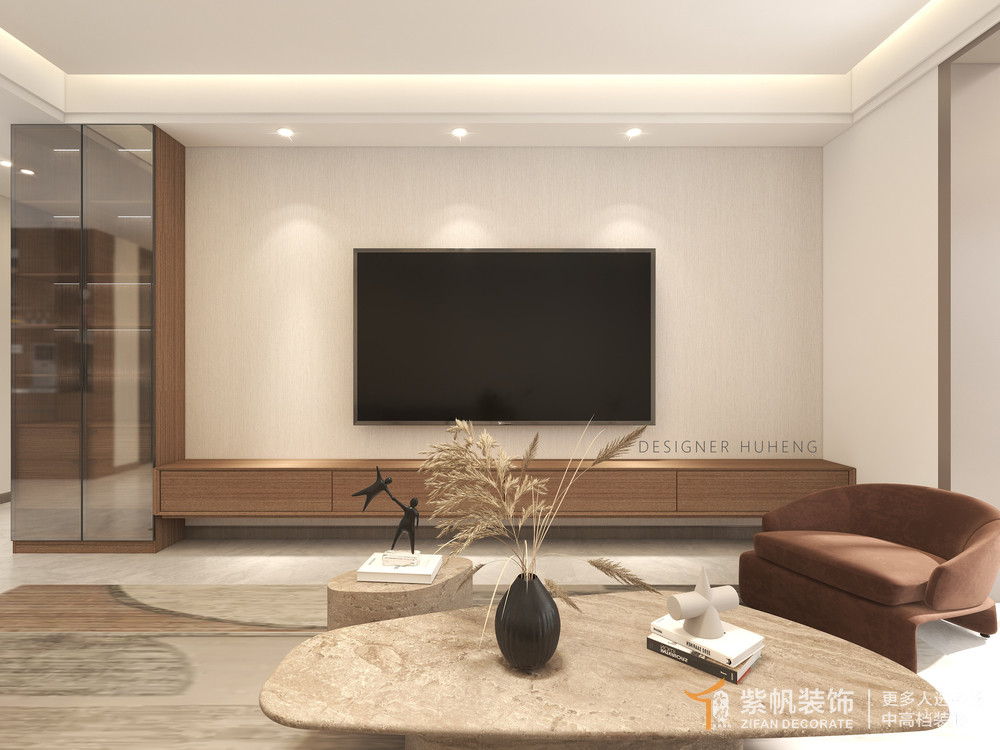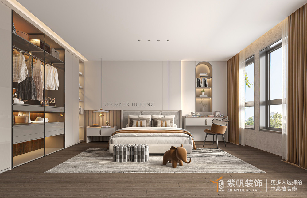案例说明:这套作品是新中风格;男主人喜欢中式,女主人喜欢温馨一些的感觉,于是公共区域做了新中式,没有复杂造型,只是通过一块暖色中式护墙板来定新中基调,再通过一些木纹和木色以及暖色灯光,二人想要的感觉都有了,主卧室比较现代,时尚的感觉让客户保持年轻。