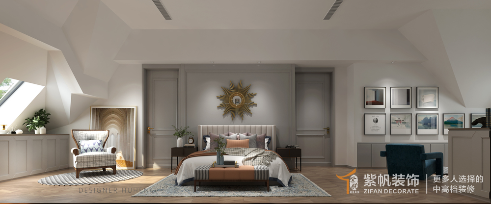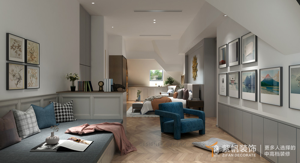 案例说明:这是一套顶层复式的户型;客厅区域分为两块,一块作为观影区,一块作为会客休闲区域,一二层连接处做的旋转楼梯,可以增加空间趣味性;二层原始顶面造型奇特,将二层最高的区域作为主卧书房主卫等主要使用空间,较低的地方作为零散的使用空间。法式轻奢既有法式的清新浪漫,又不缺失高级的轻奢氛围。