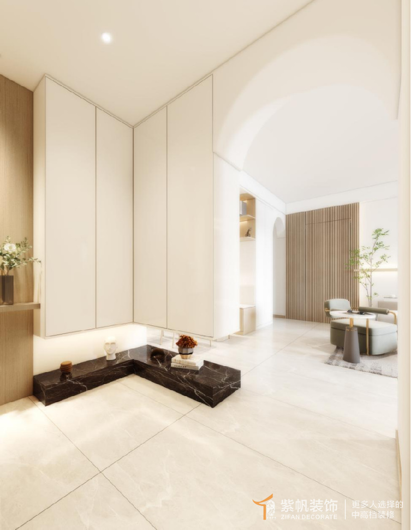 案例说明: 我愿称它为早期的奶油风,业主是一对叔叔阿姨,经常出去玩,孩子在外地工作居住,阿姨其实是一个想法很年轻的人,不喜欢一进门看到的就是沙发。在设计上给做成独立的玄关,镂空的玄关墙、弧形的垭口设计,奶咖的调色,妥妥的奶油风。整体空间上没有过多的装饰,沙发背景与主卧门的设计,造型感更好。保留两个卧室,其中一间作为衣帽间。因为常住人口两人的关系,所以主卧的卫生间拆掉,使得主卧室空间更大。