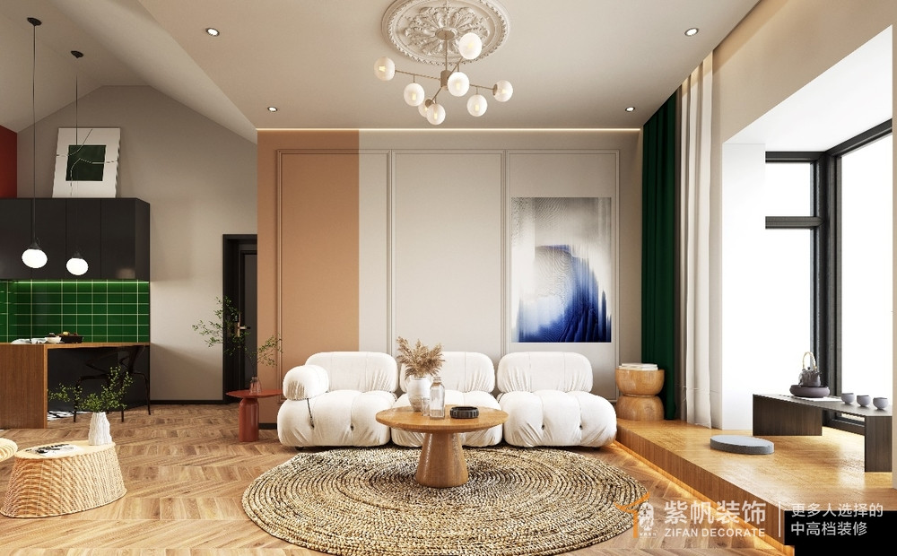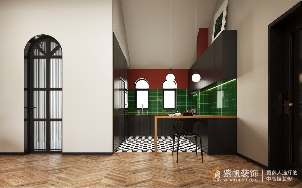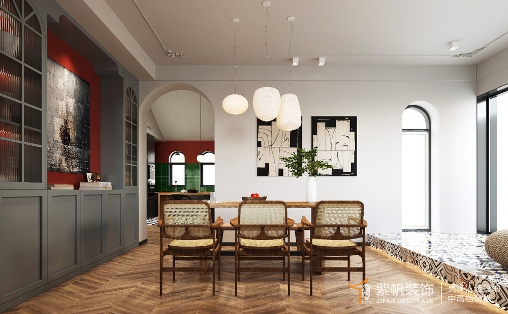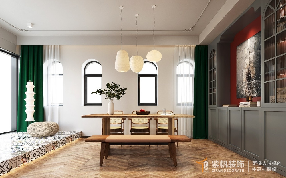 案例说明:此间住宅整体色调大面积使用绿色和红色与绿植融合,深与浅交互、叠加与对话,形成出乎意料的反差趣味,将大胆突破、极致优雅的设计概念呼之欲出,与此同时,在丰富艺术元素的砌筑组合下,反映超脱俗世的居住理想。