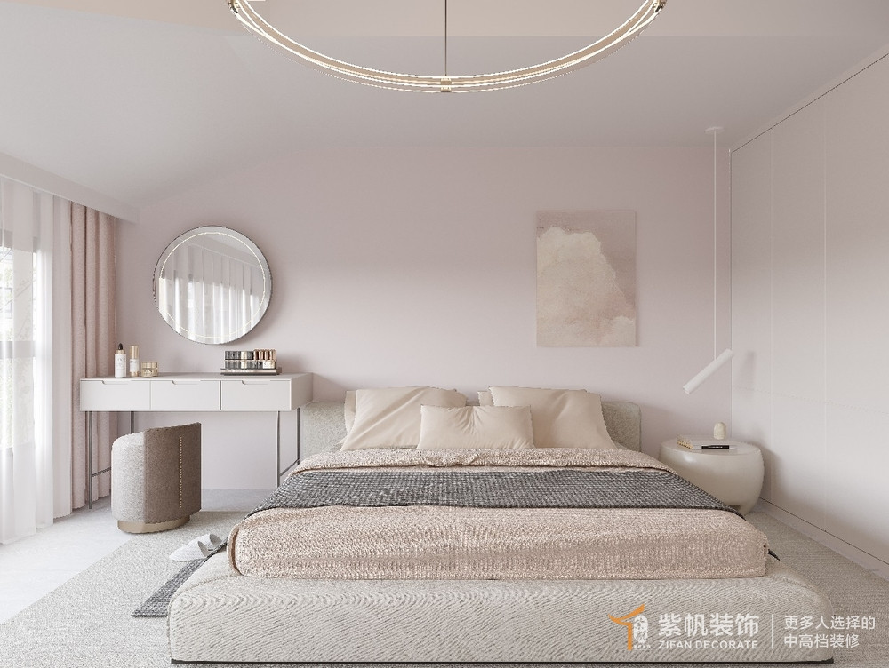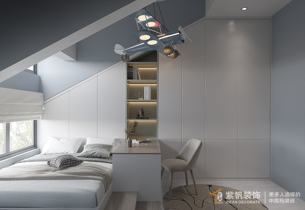 案例说明:从客厅来看,室内归家的宁静和安逸扑面而来,明净的屋内随视线纵深向前,大面积落地窗将室外的生机引入,使整个空间也随之变幻着生动气息的色彩。从进门的那刻开始,便踏入了温暖奇妙的世界,儿童房温馨明亮,整体以灰白为主,橙色作为点缀,极具创意性的儿童椅,让童趣烂漫一览无遗。