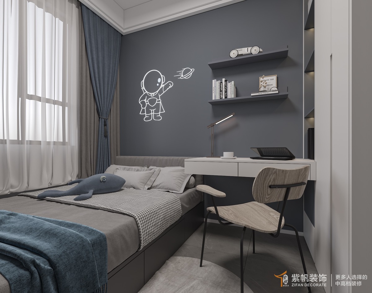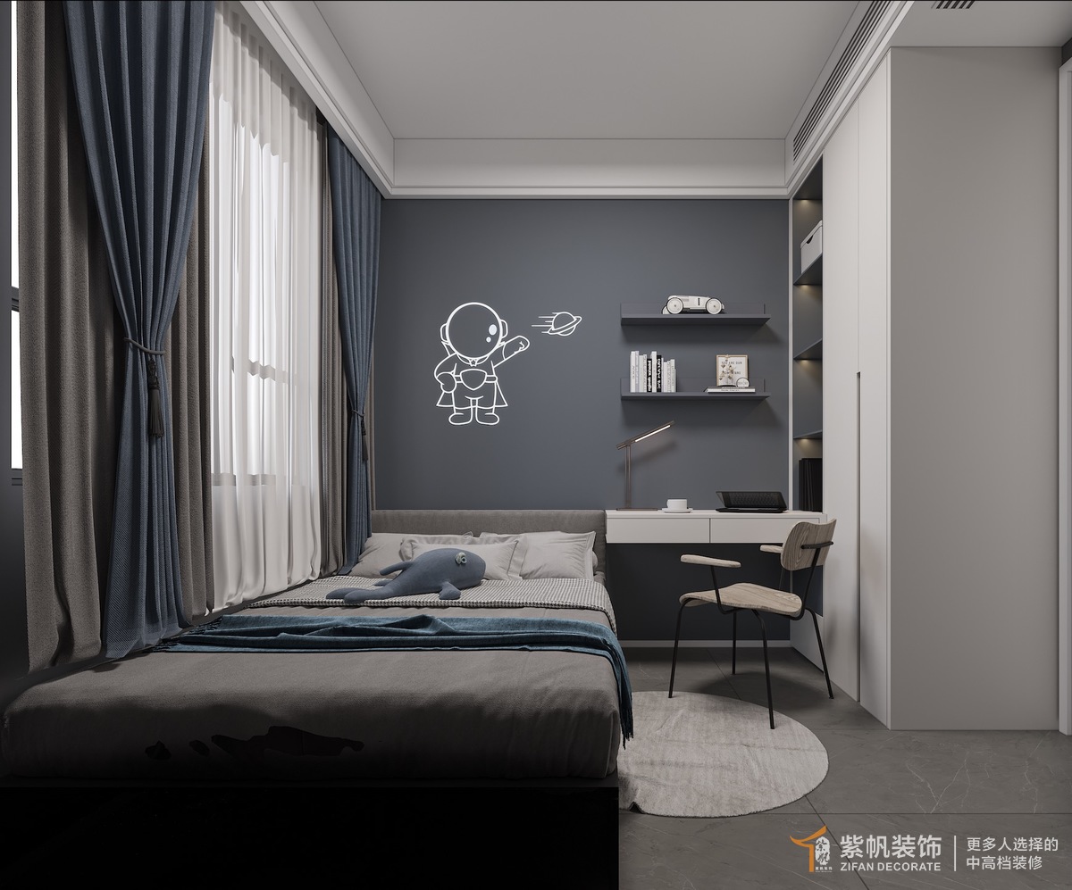 案例说明:客户是六口之家,,家里有三个孩子,实际户型只有一个阳台,后来阳台给女孩用,从客厅划分阳台出来满足晾晒功能,三个卧室都需要书桌位置,客户很喜欢落地方案。
