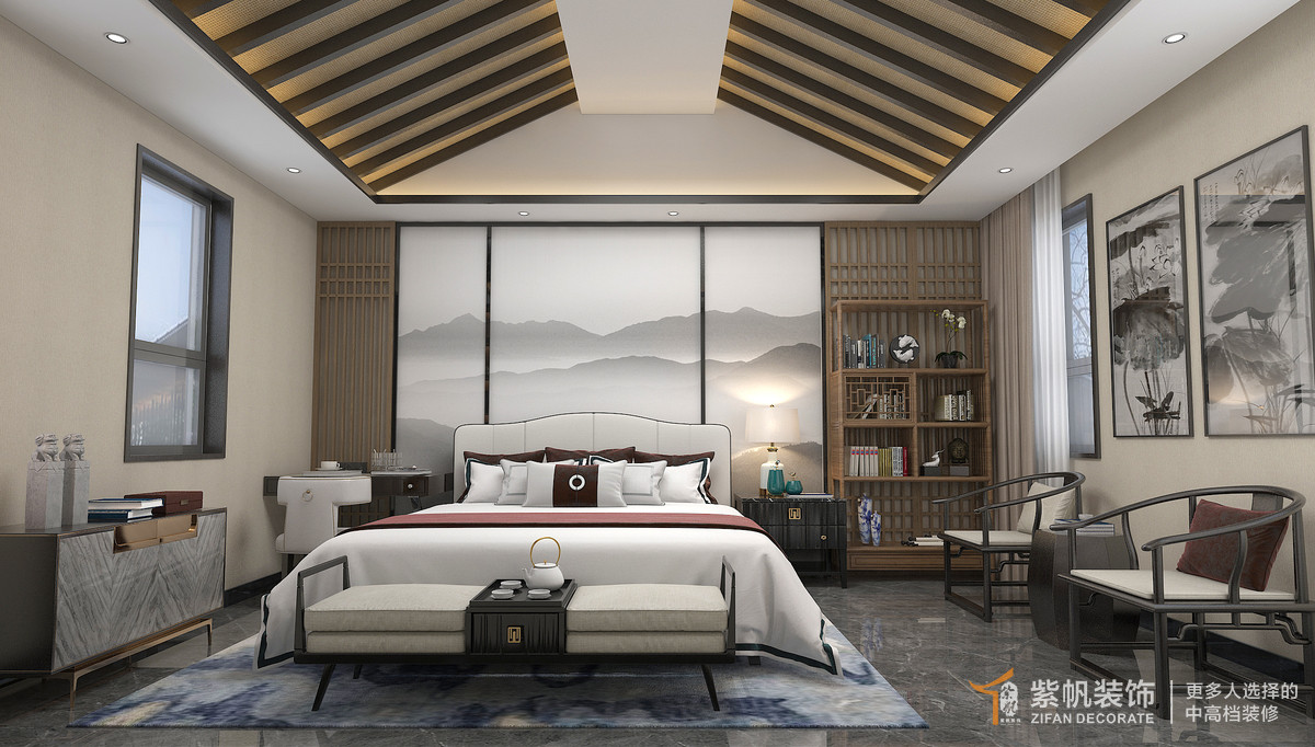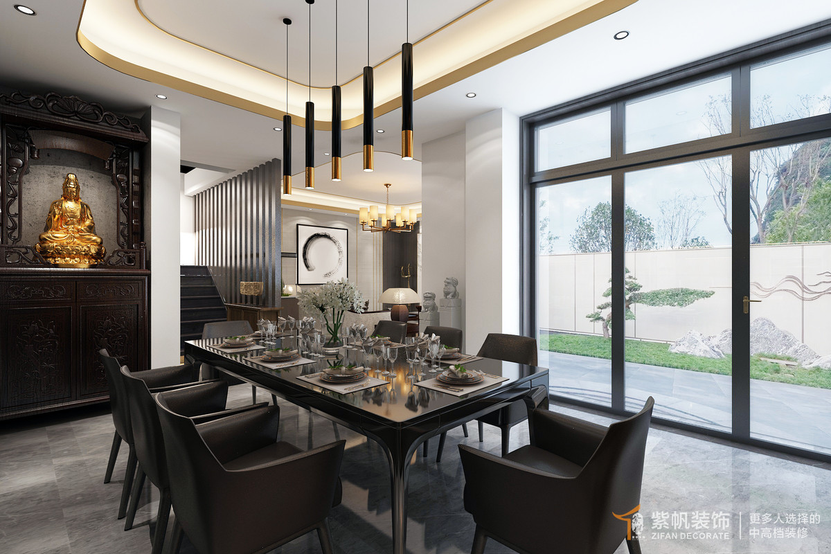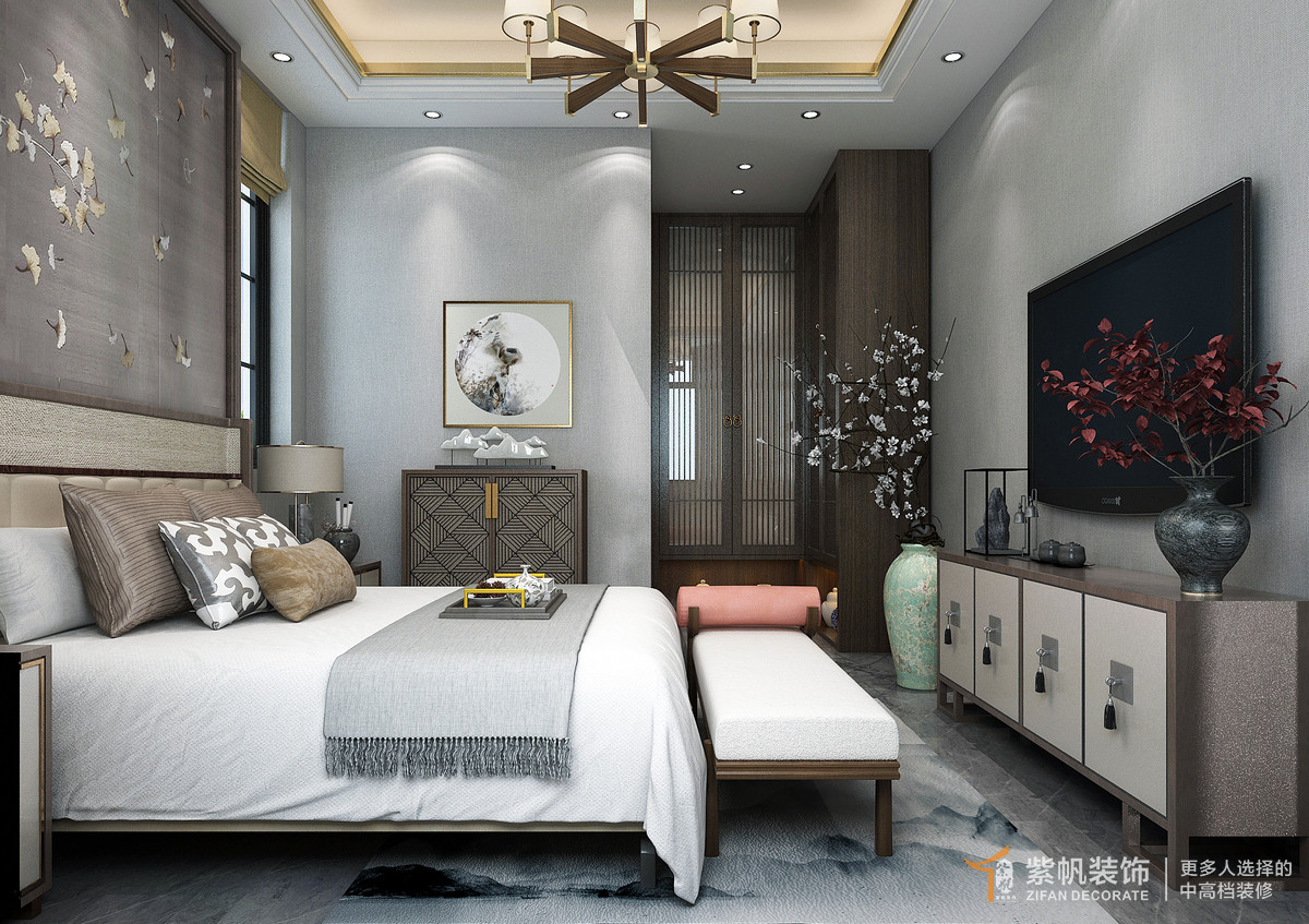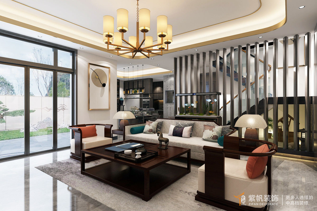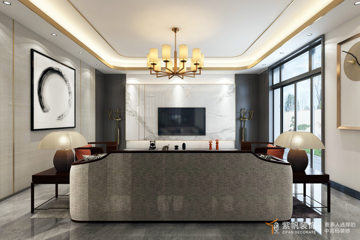 案例说明:定位轻奢新中式风格,以中国传统古典文化作为背景,结合现代时尚设计元素,营造了一个极富东方浪漫情调的居住空间。 色彩上也偏于素雅运用些许的亮色点缀,让空间宁静而不失活力。设计上使用到众多的直线条元素,棱角分明的沙发,方正大气的电视墙,极富层次感的吊顶,这些都将空间的端庄大气渲染得淋漓尽致。多处使用暖色和温润自然的木质材料。空间有着宁静与安稳的自然力量,原木色调、木质纹理和古朴的气韵,总能让空间达到一种纯净的状态,为生活注入悠然气息 ,摒弃一切冗余,这便是生活的纯粹,从纹理和木色中窥见整个树干的生长轨迹,它仿佛在跟你叙述着自然森林的灵动与恬谧。 这新中式的简约,实木的温润,一草一木皆有情调,足够让生活中的意乱,化为细致品味,忘掉工作的烦杂和家人一起舒心地享受这平凡的小日子。