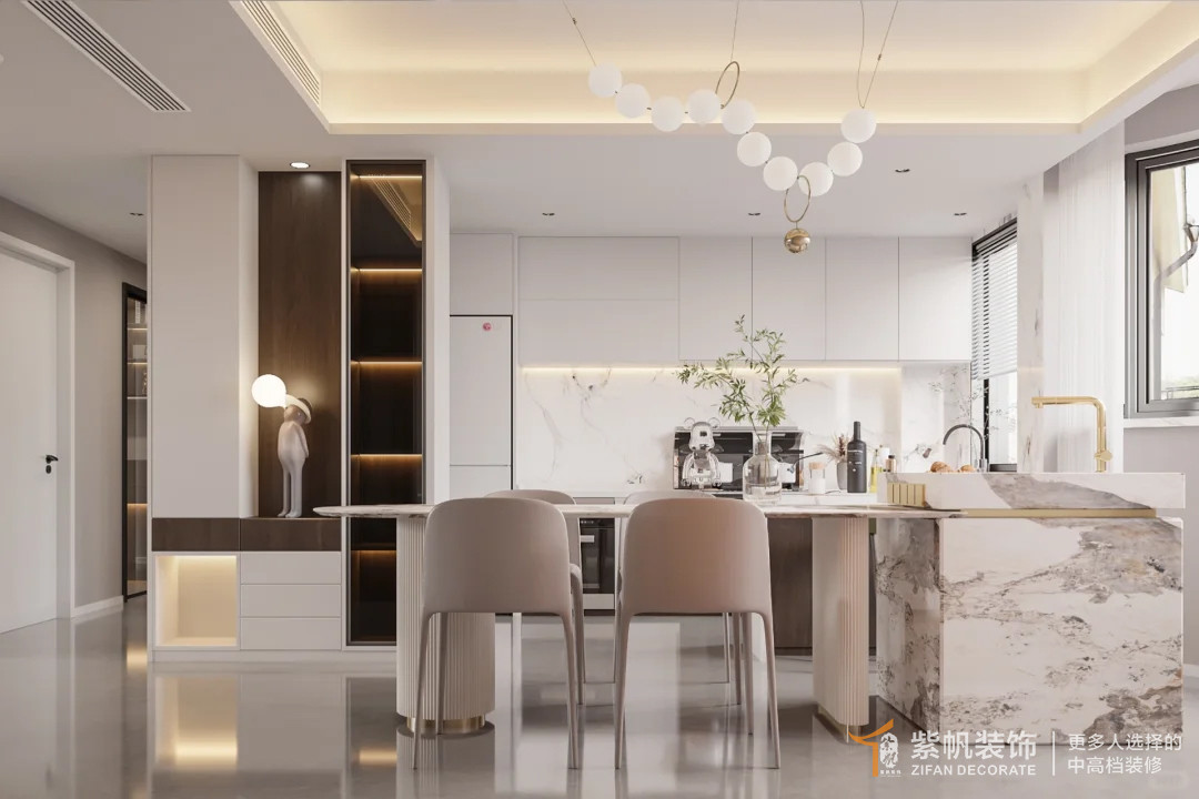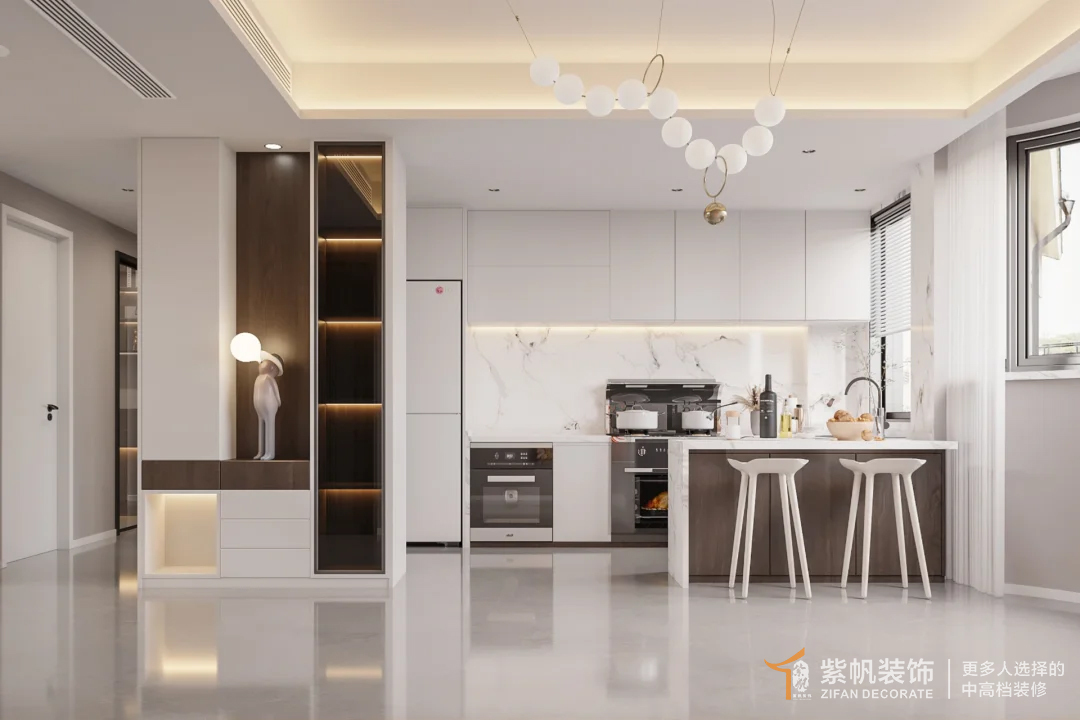 1、厨房与餐厅做开放式设计,视觉上更加通透;