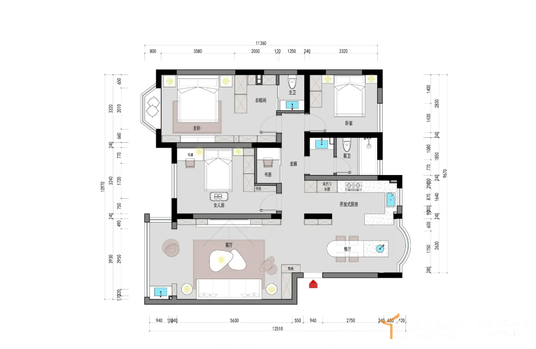 3、女儿房缩小室内空间,外侧增加书房,便于使用