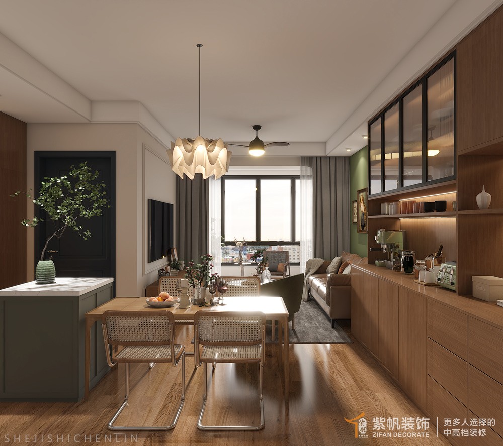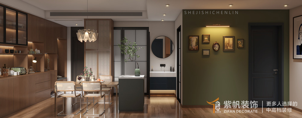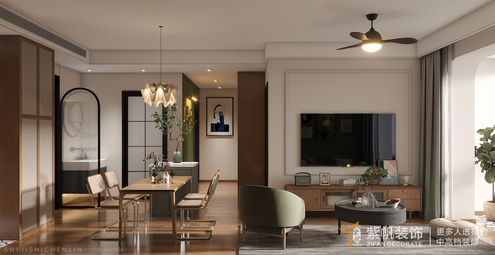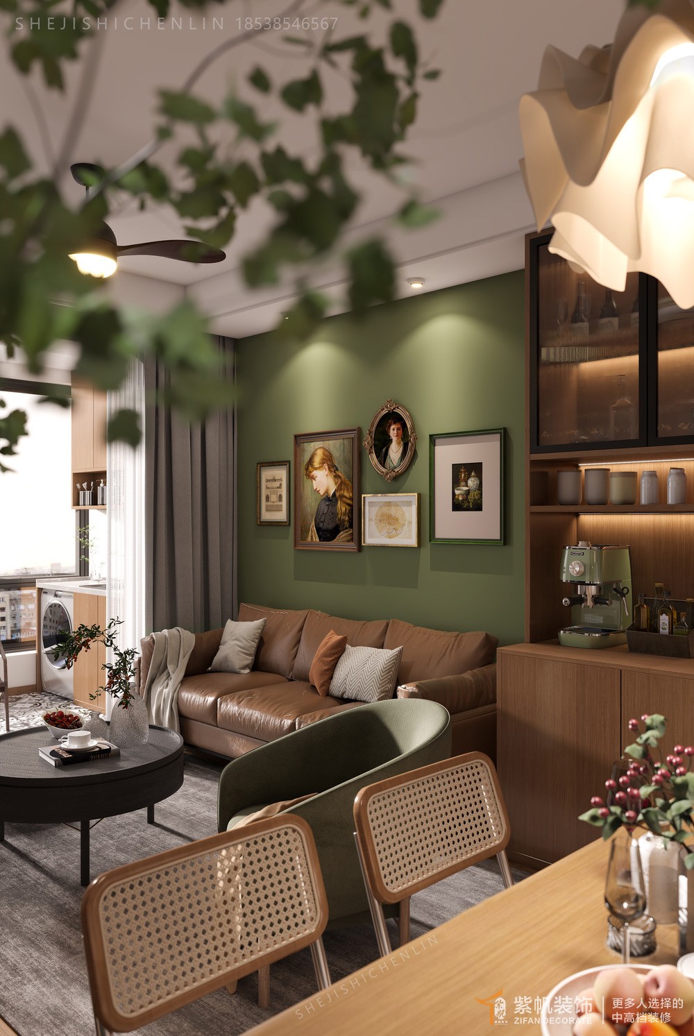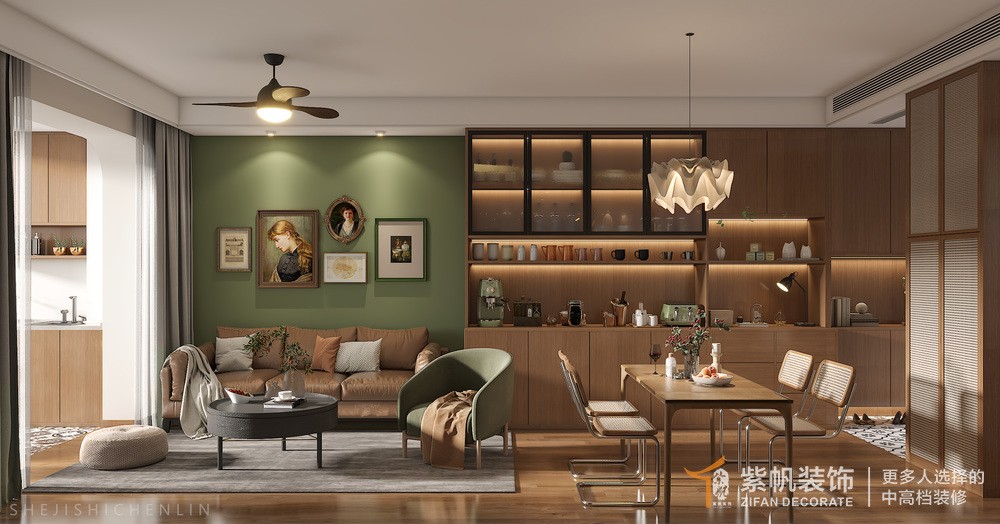 设计说明:方案风格定位复古混搭,优雅融合ARTDECO几何线条与色块碰撞的现代,并运用大量原木给人映照了一种复古的感觉,每个细节都在诉说热烈的生活态度。奶咖色,墨绿色,拱形元素,石膏线条融入复古经典,每个空间都有呼应,饱满而不会凌乱。