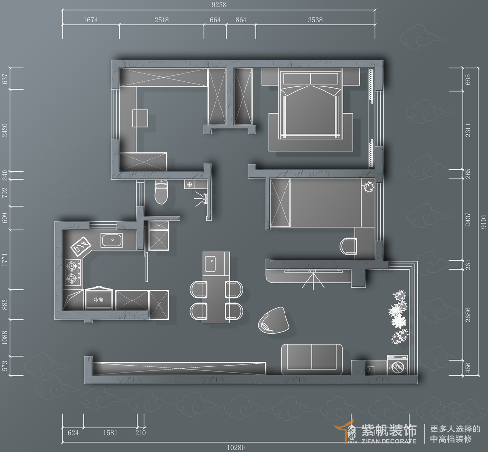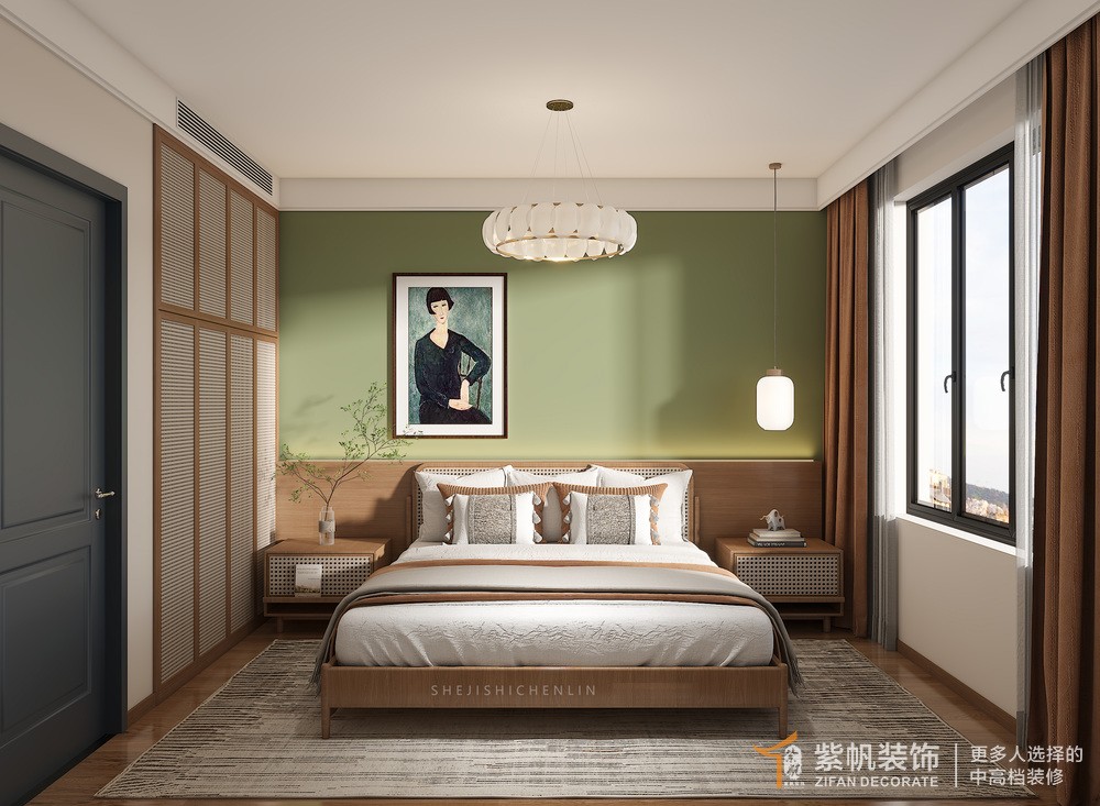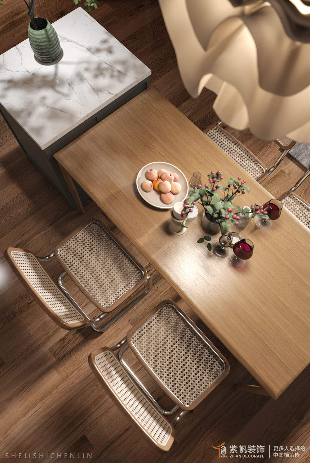 设计说明:方案风格定位复古混搭,优雅融合ARTDECO几何线条与色块碰撞的现代,并运用大量原木给人映照了一种复古的感觉,每个细节都在诉说热烈的生活态度。奶咖色,墨绿色,拱形元素,石膏线条融入复古经典,每个空间都有呼应,饱满而不会凌乱。
