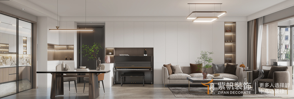 设计说明:本案以现代简约风格为主,带一点原木风的感觉,业主很喜欢原木带给人的温暖干净的家居空间,家里有小朋友弹钢琴,卧室放不下只能放在客厅,成为了客厅的一景!