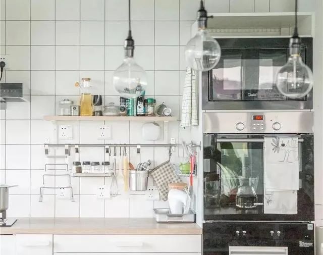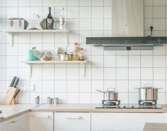 由白色橱柜+木质台面+白色文化砖装扮整个空间